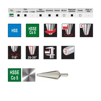 Caneluri drepte sau elicoidale Canelurile burghielor conice oferă o funcționare silențioasă, un înalt randament de tăiere și permit o îndepărtare eficientă a așchiilor rezistente, lungi (care nu se fragmentează) |