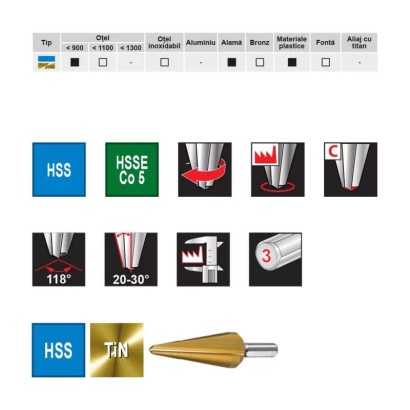 Idem HSS + acoperire cu un strat de nitrură de titan Stratul de TiN mărește rezistența la uzură, crește duritatea superficială până la aprox, 2300 HV și stabilitatea termică până la 600°C |
