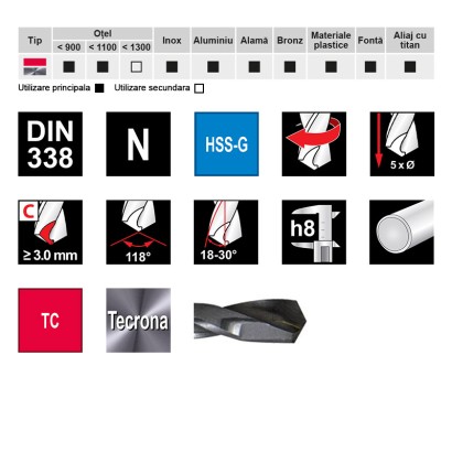 Carbură de tungsten (wolfram) Adecvat lucrărilor de găurire a oțelurilor cu rezistență superioară la viteze mari de tăiere |