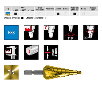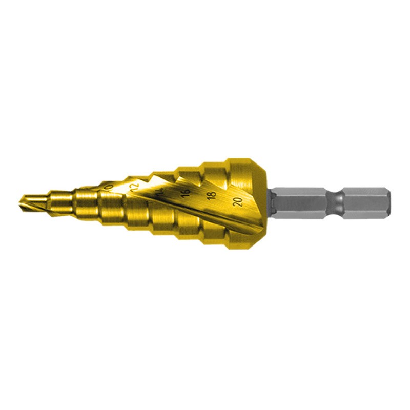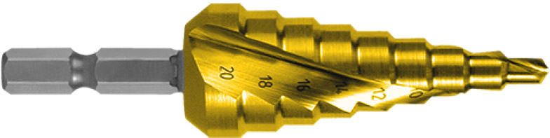 Burghie in trepte,HSS-TiN - canale elicoidale cu cBN, varf de centrare, prindere bit 1-4, RUKO
