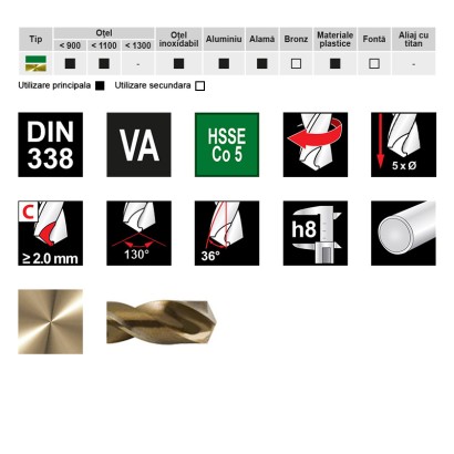 Oțel rapid foarte performant cu 5% procent de cobalt Capacitate de deformare mare și duritate la cald, pentru găurirea materialelor greu de prelucrat cu o rezistență de până la 1100 N/mm² |
