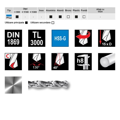 Unghiul elicoidal: 40° Profilul canalului: lat, cu muchiile din spate rotunjite Miez: îngoșat Punct unghiular: 130° Punct de tăiere: Forma C |