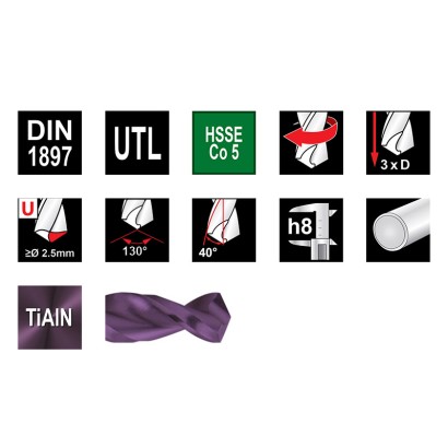 Burghie SCURTE elicoidale, DIN 1897, tip UTL, HSSE-Co 5 TiAlN - gama profesionala, RUKO