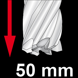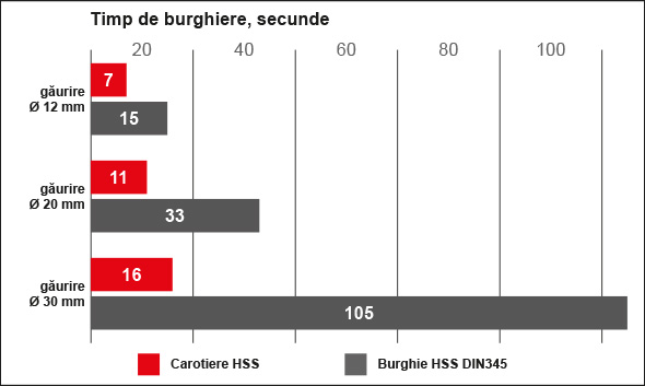 Obiect de lucru: grindă de oțel Material: oțel pt construcții St 37 - 2 Adâncimea tăierii: 12.0 mm Mașină de găurit cu suport magnetic Tăierea cu burghie elicoidale a fost făcută fără pregăurire, direct în material Nu s-au folosit agenți de răcire sau lubrifianți Carotierele RUKO economisesc timp și bani. Carotierele taie după lățimea dinților, iar burghiele elicoidale taie pe toată suprafața transversală a găurii Ca urmare, carotierele sunt mult mai rapide iar raportul în favoarea lor crește cu diametrul (vezi diagrama) Centrarea și pregăurirea nu mai sunt necesare |