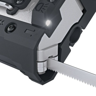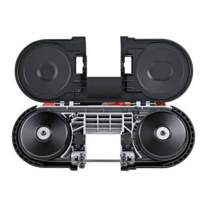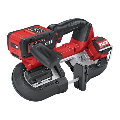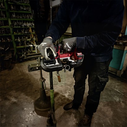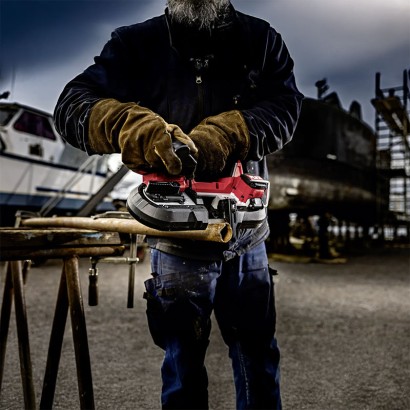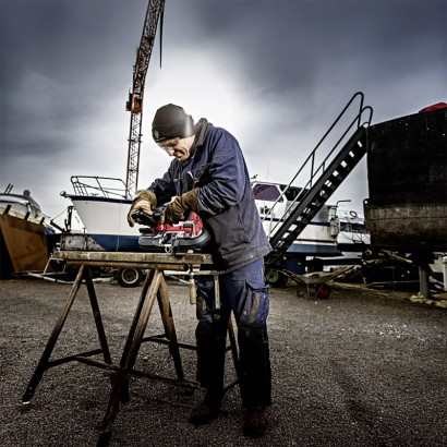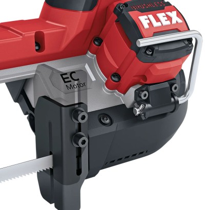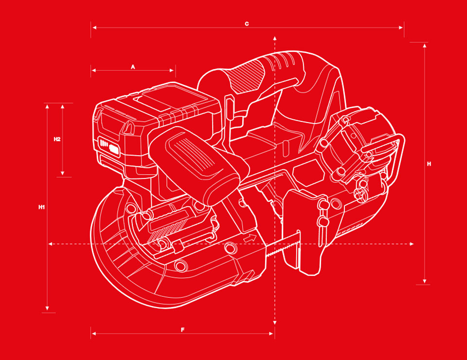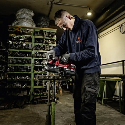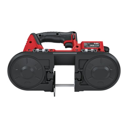 Fierăstrău cu bandă perfect echilibrat datorită designului său, susținut de o distribuție optimă a greutății bateriei și motorului