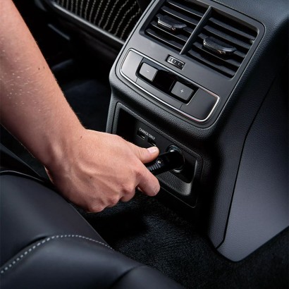 Poate fi alimentat prin tensiunea de bord de 12 V (prin adaptorul de țigară, priza auto)