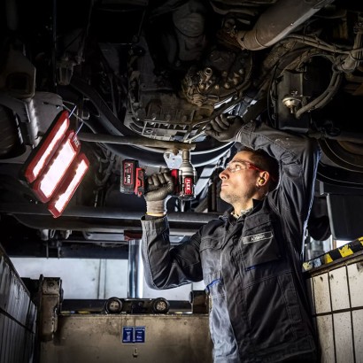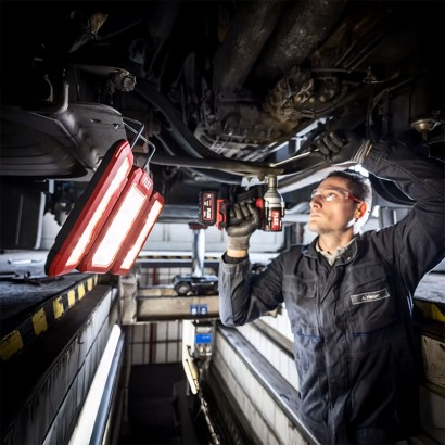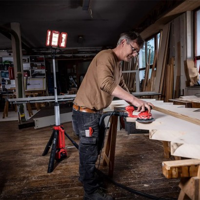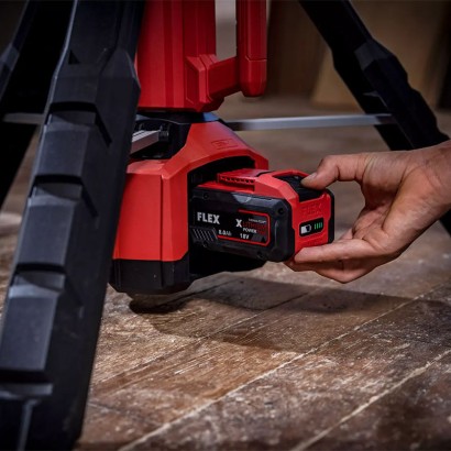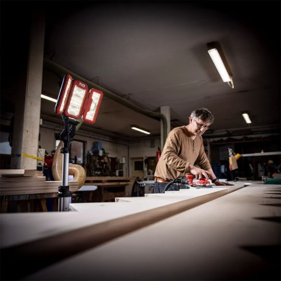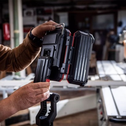 Proiectorul poate fi demontat de pe suport și utilizat ca o lanternă de lucru direct cu un acumulator de 18 V