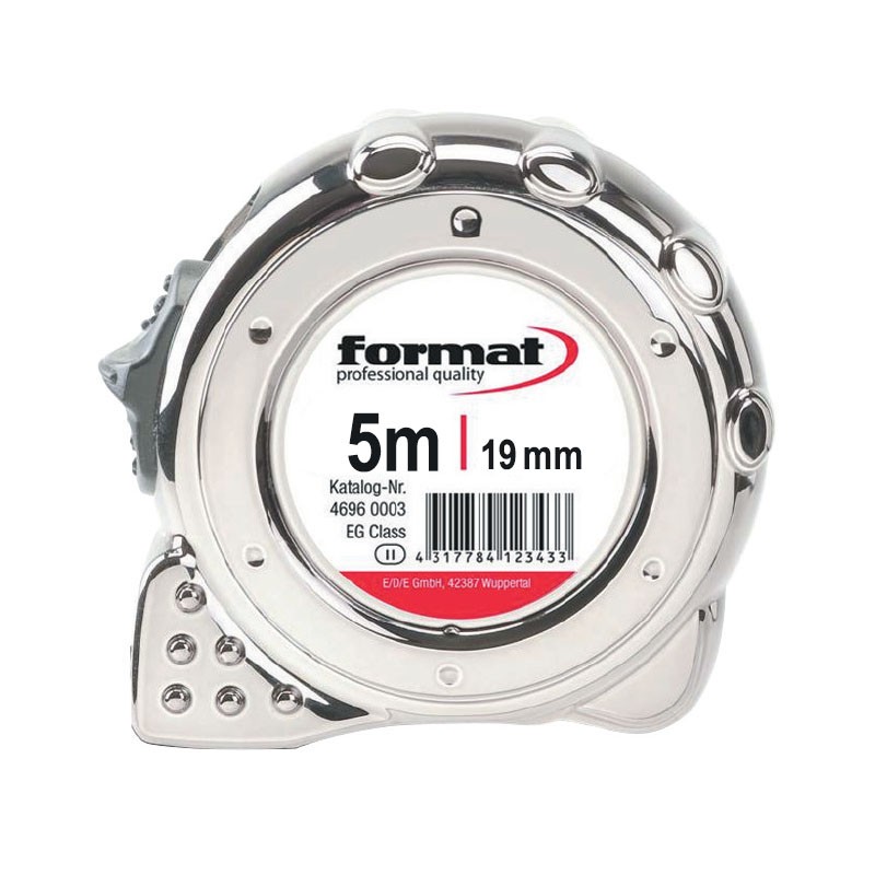 Ruleta de buzunar cu carcasa cromata si banda din otel laminat, lungime banda 5 m, latime banda 19 mm, Format