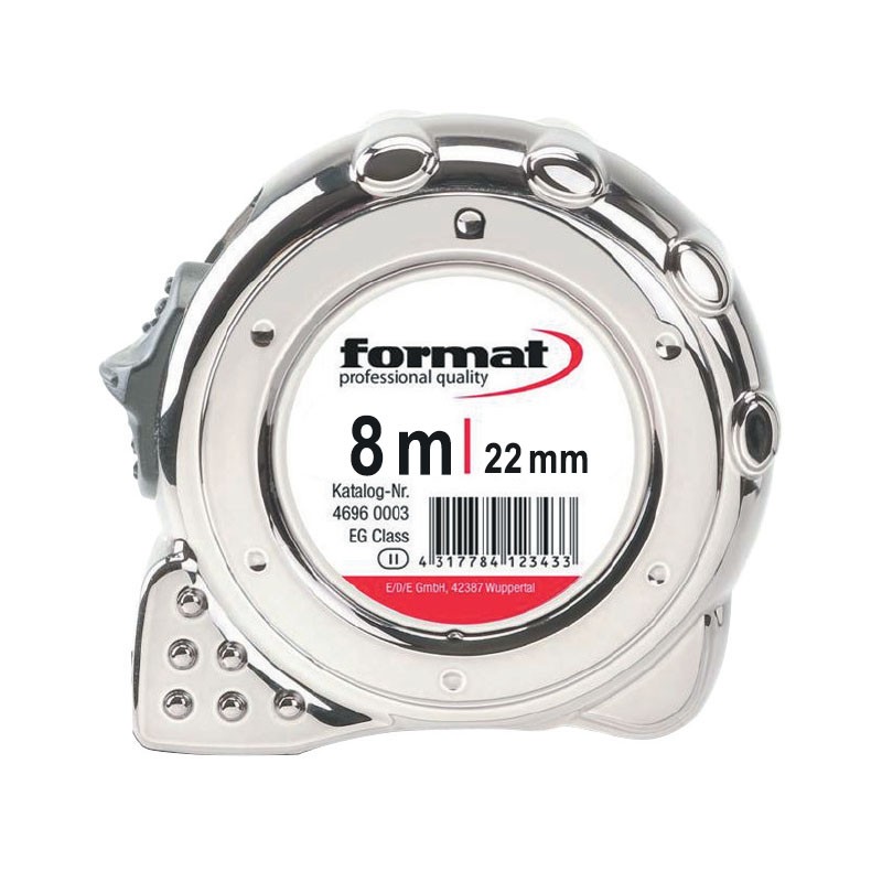 Ruleta de buzunar cu carcasa cromata si banda din otel laminat, lungime banda 8 m, latime banda 25 mm, Format