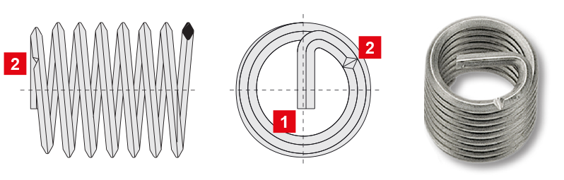 După instalare, poziția fixă a filetului este menținută ferm grație presiunii aplicate de spirele bobinei pe suprafața interioară a găurii filetate. Aceasta presiune se dezvoltă ca urmare a faptului că diametrul bobinei este mai mare decât diametrul găurii în care se montează, cu o valoare precis calculată. În stare liberă, inserțiile au un diametru mai mare decât gaura filetului, din materialul de bază în care urmează să fie instalate. În timpul operației de montare diametrul bobinei se reduce permițând astfel introducerea inserției în gaura filetată. Atunci când inserția este montată la adâncimea corectă, bobina se extinde și se fixează permanent. |